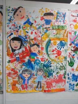 1年生が図工の授業で共同製作した絵の題材「スタンプ、スタンプ!」を紹介します。子どもたちは自分の手や身の回りの素材に絵の具をつけて楽しみながら模造紙にスタンプしました。さらに画用紙に自画像を描いて貼り合わせ、それぞれの思いを色とりどりの画面に込めて表しました。ホームページのみでの紹介となりますが、楽しみながらご覧になってください。