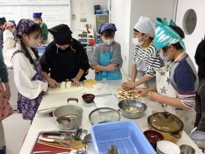 5年生は、家庭科の学習「食べて元気に!ご飯とみそ汁」で調理実習を行いました。12月に自分たちが仕込んだ味噌を使ってみそ汁を作りました。みそ汁の実は班のメンバーで考え、持ち寄りました。ご飯はおこげがついて、美味しく炊き上がりました。