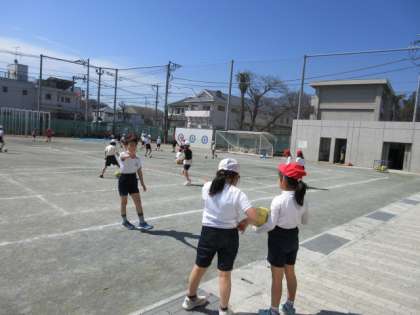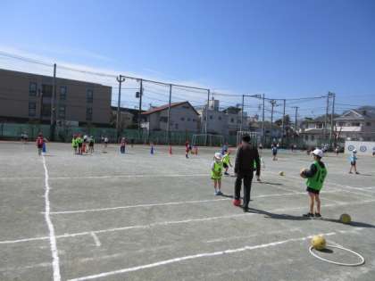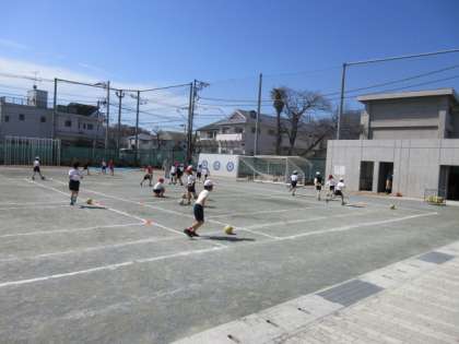 3月11日、2年生3クラスが体育授業で「ボールけりゲーム」を行っている様子をご紹介します。暖かい春の日差しの中、子どもたちは協力しながら授業に取り組んでいました。