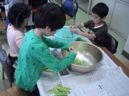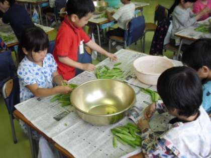 5月15日(水)1年生は、グリンピースのさやむきに挑戦しました。この日の献立は、グリンピースごはん。1年生の子どもたちがむいたグリンピースが、給食に使われました。普段は苦手のグリンピースですが、この日ばかりは、がんばって食べていました!