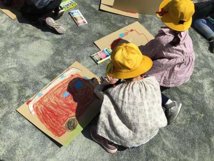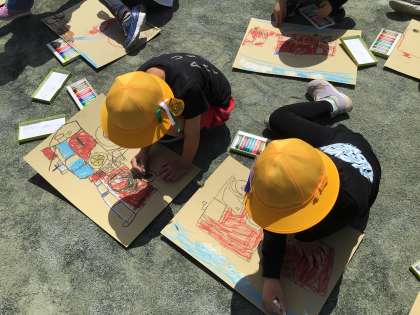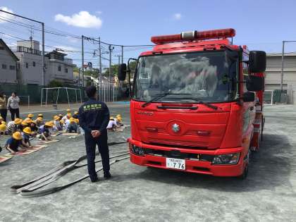4月16日、世田谷消防署の消防車を見ながら1年生がはたらく消防写生会に取り組みました。風が強く吹く中、子供たちは迫力ある絵を元気よく描きました。