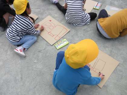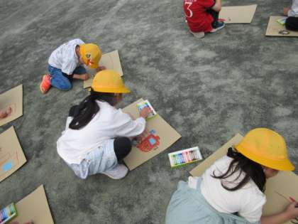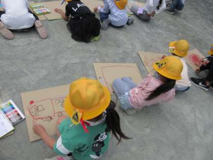 4月16日、世田谷消防署の消防車を見ながら1年生がはたらく消防写生会に取り組みました。風が強く吹く中、子供たちは迫力ある絵を元気よく描きました。