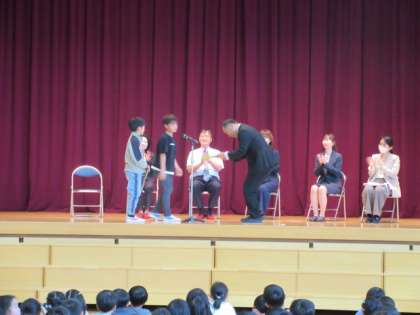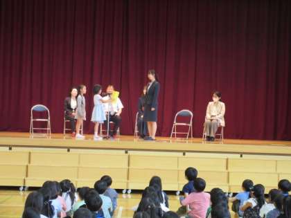 4月26日、令和6年度離任式を行いました。3月に城山小を去った教職員の皆さんが子供たちへお別れの挨拶をするために来校されました。校務等の都合で全員ではありませんでしたが、代表児童が感謝の言葉を伝え、去られた教職員の皆さんが一言ずつ子供たちへ挨拶をしました。