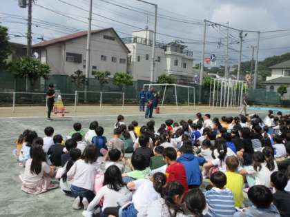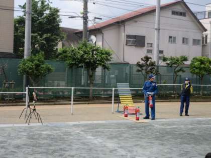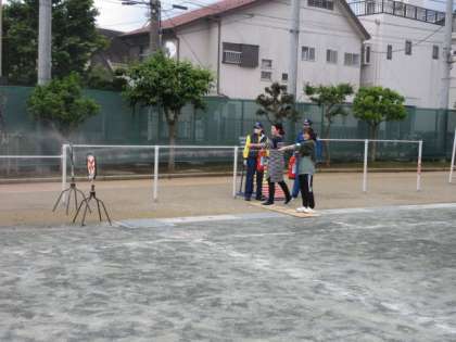 今回の避難訓練では世田谷区の防災安全担当職員の方に来ていただき、消火器訓練のシミュレーションを行いました。子供たちの体験はありませんでしたが、2名の教員が消火器訓練を体験しました。