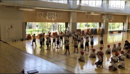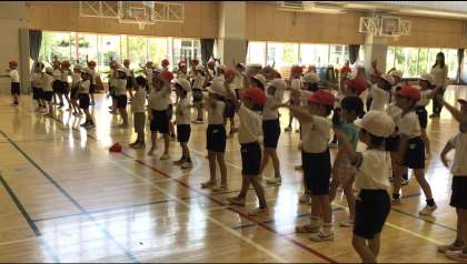 運動会に向けて練習が始まりました。音楽に合わせて一生懸命踊っています。他のクラスの踊りを見たり、自分の踊りを見てもらったりして、上手なところや良かったところを発表し合いました。