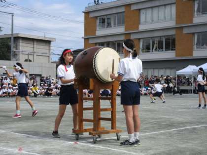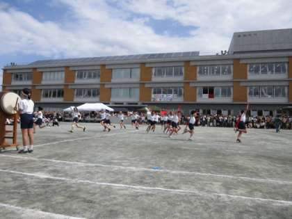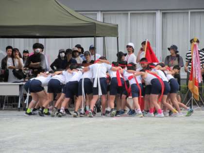応援合戦では、5・6年生の応援団員が今までの練習の成果を発揮して精一杯頑張りました。白組・赤組の児童は応援団に合わせて声を出し、歌い、競技へ向けて勢いがつきました。