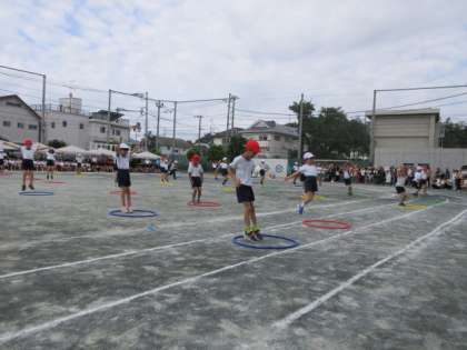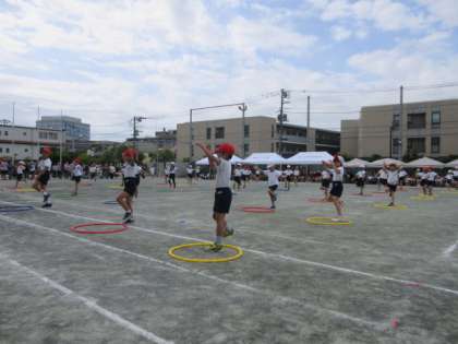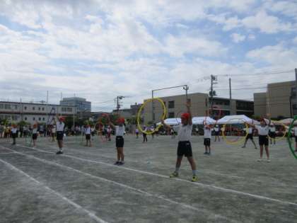 3年生は表現運動でフラフープを使い、「フーシングダンス〜広げようみんなの輪〜」に取り組みました。にこやかな表情で演じている姿が印象的でした。