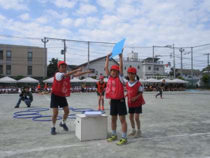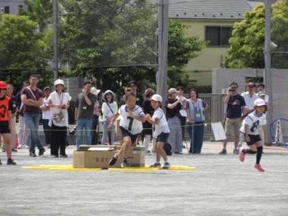3年生は学年種目で「しろねこヤマト」という競技に取り組みました。3人のチームでカードを引き「集配物に見立てた段ボール箱を運ぶ」または「カードに貼ってある写真の先生にサインをもらう」ことを協力して競い合いました。