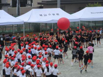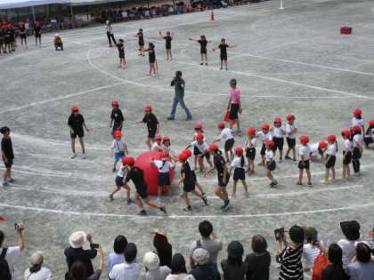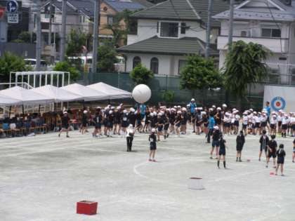 数年ぶりに全校種目「大玉送り」に取り組みました。低学年は大玉をたたいて進め、高学年は大玉をたたき上げながら競い合いました。競技サポーターの子どもたちも活躍し、3回戦行い2勝1敗で白組が勝ちました。
