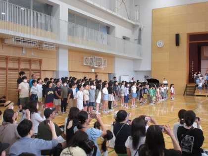 5月30日、朝の活動時間に音楽朝会を行い、2年生が発表しました。最後に「虹」を全校児童で歌い、体育館に虹がかかったように歌声が響きました。今年から発表学年の保護者の方は参観できますので多くの方にお越しいただきました。