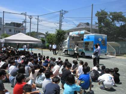 6月11日、地震を想定した避難訓練を実施しました。子どもたちは世田谷区の防災担当職員から起震車について説明を聞き、教員2名が震度7の揺れを体験しました。その後は5・6年生が順番に起震車を体験しました。