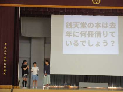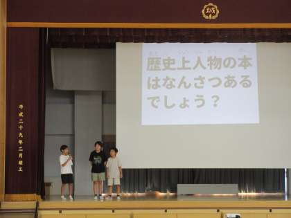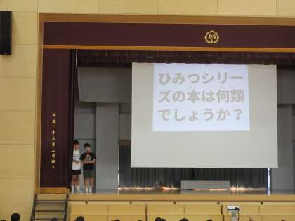 7月4日、朝の活動時間に児童集会(図書委員会)を行いました。図書室にある本に興味を持ってもらうため、図書委員会の児童がクイズを企画しました。よく練られた質問もあり全校児童は楽しみながら答えていました。