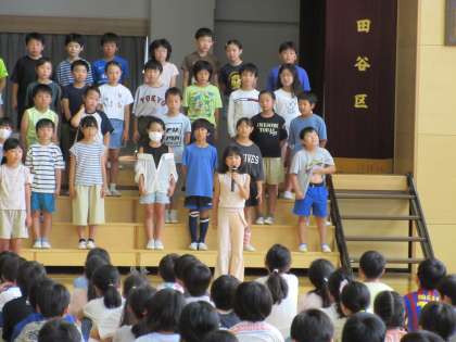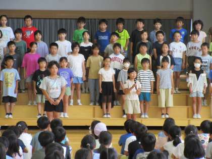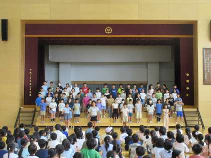 7月11日、朝の活動時間に音楽朝会を行い、4年生が「いろんな木の実」を発表し、体育館にきれいなハーモニーを響かせました。その後、全校児童で楽しみながら城山音頭の練習を行いました。