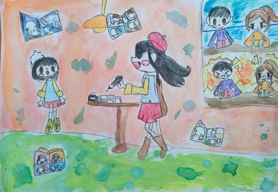 3年生が図工授業で制作した題材「未来にタイムスリップ」を紹介します。子どもたちが「なりたい自分」を思い描き、絵で表しました。この作品では、下絵の線をボールペンでなぞり、色鉛筆で形を塗り、広い面を水彩絵の具で塗りました。学校ホームページのみでの紹介になりますが、子どもたちが思い描く将来の自分の姿をご覧ください。
