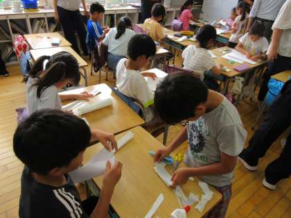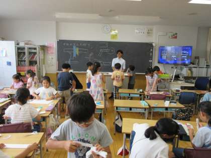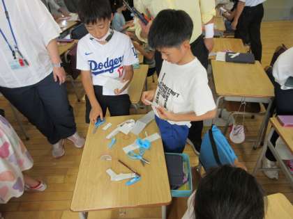 7月17日、本年度の校内研究の主題「自立した学び手の育成」に基づき3年1組対象に研究授業を行いました。「ゴムと風の力のはたらき」の単元を学習し、子どもたちは夢中になって紙のゴム鉄砲を作りました。また、性能をよくするために改良する過程で協働的な学びを深めることができました。
