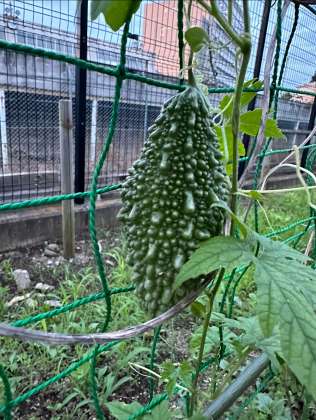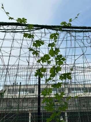夏休みに入りました。1枚目の写真は、終業式が終わった金曜日の夕方。そして土日をはさんだ月曜日の朝の様子が、2枚目の写真です。わずか2日間でこんなにもゴーヤは変化していました。最後の3枚目の写真は、全体の様子です。下の方の白いものは、7月5日のゴーヤの背の高さを表しています。2週間ちょっとで、ついにはネットよりも高くなってしまいました。