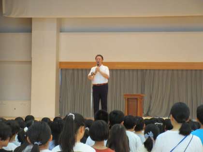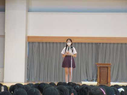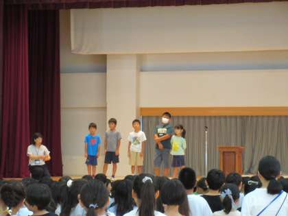 始業式が終わり、転入生の紹介がありました。また、代表委員の6年生から「学び舎挨拶運動」についての連絡、生活指導担当の先生から学校生活についての話がありました。