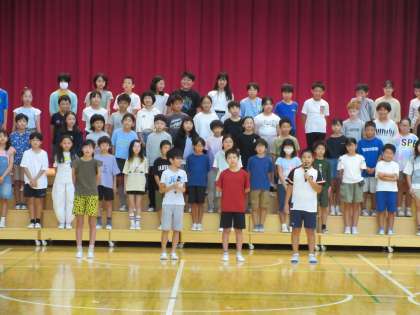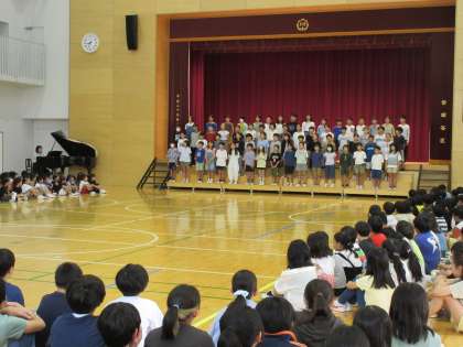 9月19日、朝の活動時間に音楽朝会を行い、全校児童で「君をのせて」を合唱しました。その後、5年生が「誰かがくちぶえふいた」を発表し、体育館にきれいなハーモニーを響かせました。ご来校いただいた保護者の皆様ありがとうございました。