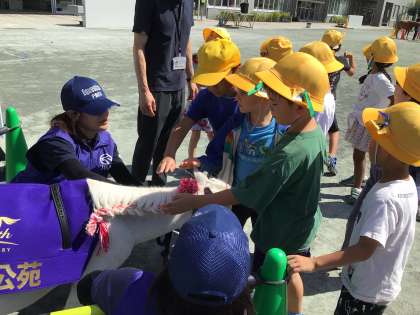馬の種類や走り方などのお話を聞いた後は、ふれあいタイム!4頭それぞれ個性があり、子どもたちも大興奮しながら、ふれあいを楽しみました!!