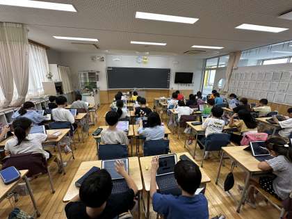 一方、下の写真は総合の授業の様子です。夏休みの宿題で選んだ3つの仕事を重点的に調べています。本当に集中していて、キーボードを打つ音しか聞こえてきません。