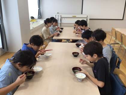 みそ汁の具は、いちょう切りのだいこん、短冊切りの油あげ、小口切りのねぎです。1学期より、包丁の使い方が格段にうまくなっていました。みんなでおいしくいただきました。