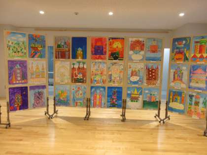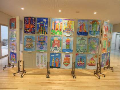 4年生が図工授業で制作した題材「夢のお城」を1階ギャラリーに展示しました。子どもたちはイメージを広げ、自分だけの夢のお城を構想してアクリル絵の具で描きました。一人一人が思い描いた夢のお城には味わい深い風格があります。保護者・地域の皆様、ご来校の際にはぜひご覧になってください。