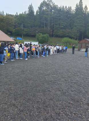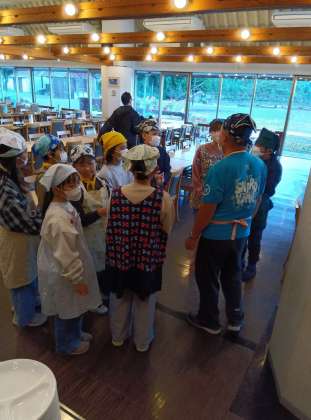 移動教室の2日目の朝を迎えました。二つの学校で合同で朝会を行いました。朝会が終わると食事係は、早速、朝食の準備です。みんな元気です。