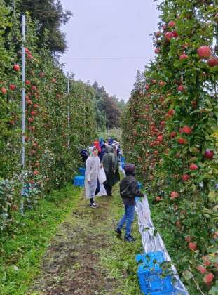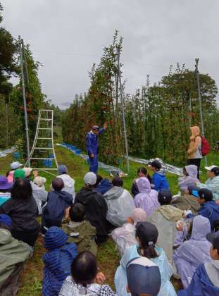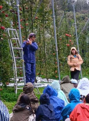 リンゴ農家の方からりんごのもぎ方の説明会を受け、いよいよリンゴをもぎます。お土産を渡す人の顔を思い浮かべながら、美味しそうなリンゴを選びます。みんな元気です。