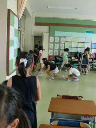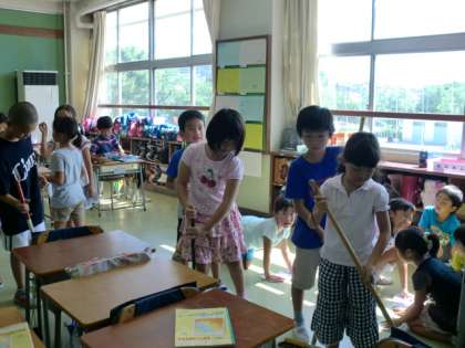 夏休み中、子どもたちが清掃をしていなかった学校は、あちこちにほこり・・・2学期が始まり、全校で清掃をすると気もちよい空間に変わりました。それぞれが自分の持ち場をしっかりそうじをするとき、おしゃべりは必要ありません。みな黙って、もくもくと取り組んでいます。意志を伝えたい時は、アイコンタクトやジェスチャーで。