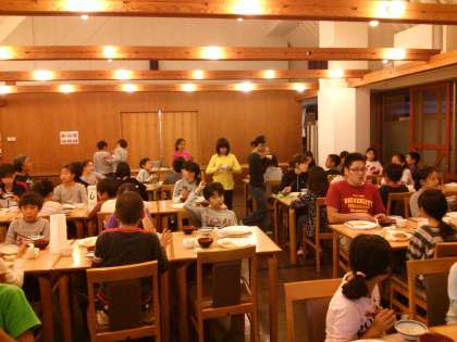 晴天に恵まれ、雨乞山の頂上から見た景色は、最高でした。夕食が美味しいです。食事の後は、お楽しみのキャンプフアイヤーです。