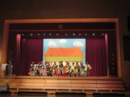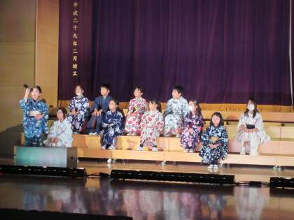 4年生は演目「まぬけ村」を練習してきました。ある平和な村にやって来たお殿さまから、兵士を集めるように命令されます。村人たちは知恵をしぼってまぬけなふりをして役人たちをだまそうと計画を立てます。はたして平和な村を守ることができるでしょうか?4年生が協力しながら作り上げた舞台をぜひご覧ください。
