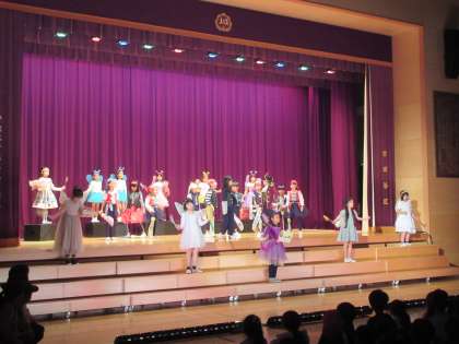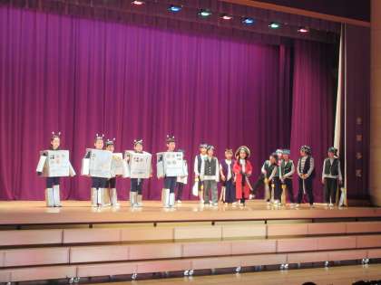 2年生は演目「おかしのすきなかいぞくのおかしなおかしなおかしなたび」の発表をとおしておいしいお菓子をたくさん食べるより自分たちで食べられる分だけ作るのがいいことに気づくことができました。今までの練習の成果を発揮して、元気よく演じきり、最後に皆で「おかしが好き」を歌って締めくくりました。