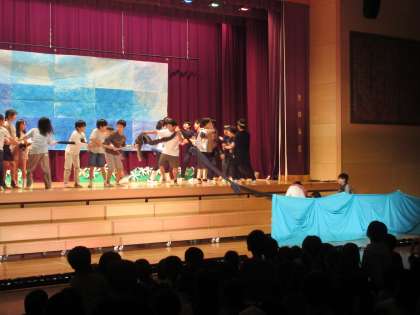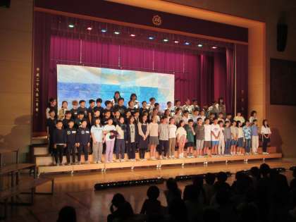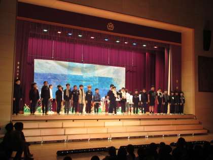 5年生は演目「ぼくのロボット」の発表をとおして「正しいことをする大切さ」を学びました。マフラー星人の誘惑に負けず友だちを助けるためにマフラーを繋いだシーンが印象に残りました。今までの練習の成果を発揮して善と悪の違いを元気いっぱい演じきりました。最後に皆で「BFF(ベストフレンドフォーエバー)」を歌い体育館に美しい歌声を響かせました。