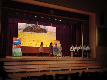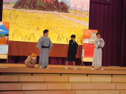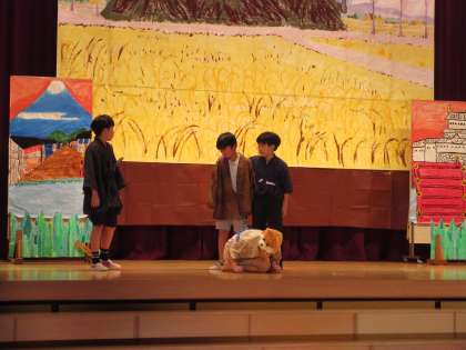 6年生は演目「2100年の青い鳥」」の発表をとおして「本当の平和は互いの心の中にある」ことを学びました。タイムパトロール隊が様々な時代へ青い鳥を探しに行きましたがどの時代にも争いがあり、最後に現代に戻り答えにたどり着くことができました。小学校生活最後の学芸会、子どもたちは精一杯演じきり素晴らしい舞台に仕上げることができました。全員合唱「Tomorrow」ではピアノ、ギター、ベース、パーカッションを子どもが伴奏して体育館に美しい歌声を響かせました。