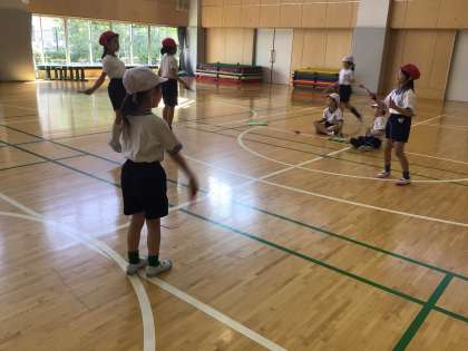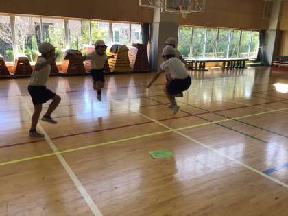 学校全体で今日からピョンピョン期間が始まりました。それに合わせて体育でも、カードを使って技の練習や検定を行っています。授業の1時間で「できない技をできるように練習する。」「友達にアドバイスをする。」「自分の検定を進める。」のどれかを目標にして自分で進めて行くように声かけをしています。今日は初回だったので、友達と集まって練習をしている姿が見られました。