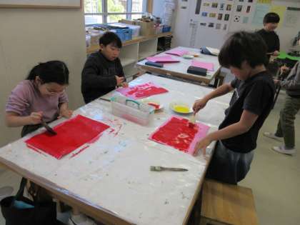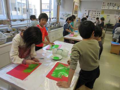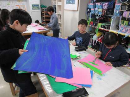 12月10日、4年2組では来週予定されている『世田谷美術館「緑の惑星 セタビの森の植物たち」プレワークショップ』のために色画用紙の着色に取り組みました。子どもたちはのびのびと絵の具を塗って自分なりの葉っぱをイメージしました。次回の特別授業では色画用紙を葉っぱの形に切り抜き、10枚を連結させて植物をイメージした作品をつくります。