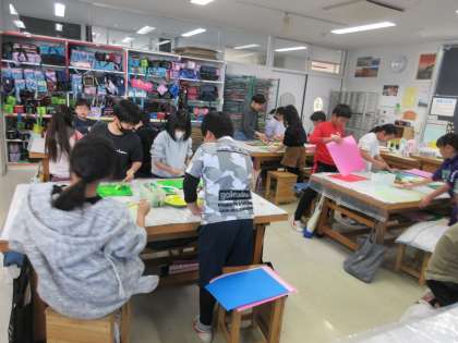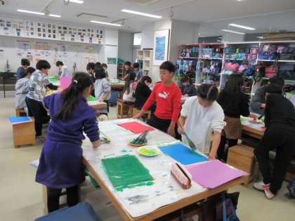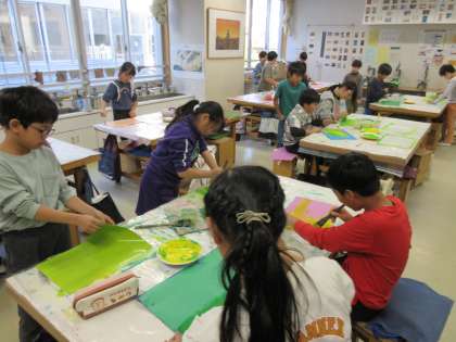 12月10日、4年2組では来週予定されている『世田谷美術館「緑の惑星 セタビの森の植物たち」プレワークショップ』のために色画用紙の着色に取り組みました。子どもたちはのびのびと絵の具を塗って自分なりの葉っぱをイメージしました。次回の特別授業では色画用紙を葉っぱの形に切り抜き、10枚を連結させて植物をイメージした作品をつくります。