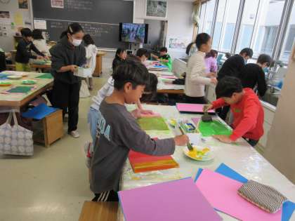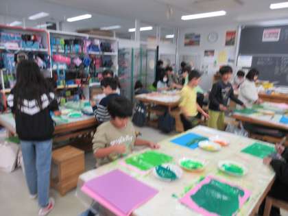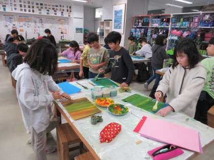 12月11日、4年1組では来週予定されている『世田谷美術館「緑の惑星 セタビの森の植物たち」プレワークショップ』のために4年2組と同様に色画用紙の着色に取り組みました。子どもたちは絵の具遊び的な感覚で葉っぱをイメージしてダイナミックに絵の具を塗りました。特別授業でつくる植物がどのような作品になるか楽しみです。