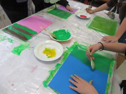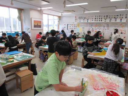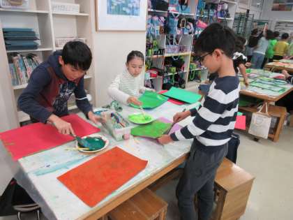 12月11日、4年1組では来週予定されている『世田谷美術館「緑の惑星 セタビの森の植物たち」プレワークショップ』のために4年2組と同様に色画用紙の着色に取り組みました。子どもたちは絵の具遊び的な感覚で葉っぱをイメージしてダイナミックに絵の具を塗りました。特別授業でつくる植物がどのような作品になるか楽しみです。