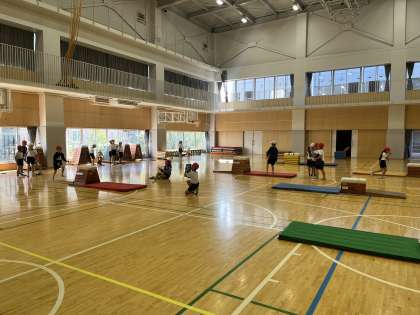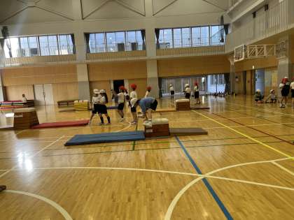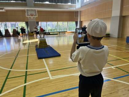 跳び箱遊びの活動を行いました。1年生の時から跳び箱遊びに親しみ、慣れて来たので、開脚とびのポイントをおさえてから、「跨ぎ越す」→「跳び越す」練習を始めました。1段から徐々に段数を上げて挑戦し、4段や5段をきれいに跳ぶことができるようになってきました。友達にタブレットで動画を撮ってもらい、自分の跳び方を見直しながら取り組みました。