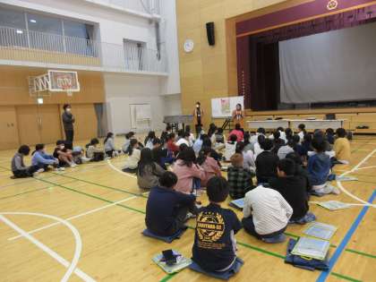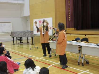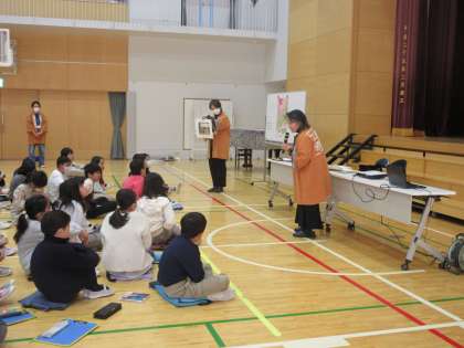 12月20日、経済産業省委託事業として5年生対象に「伝統工芸(木版画)を学ぼう」の特別授業を実施しました。まず初めに職人さんから江戸時代に花開いた浮世絵版画の伝統的な作り方や日本の工芸品についてDVDを視聴しながら説明されました。その後、グループごとに浮世絵版画の版を実際に摺り重ねる体験をしながら木版画の伝統技法に触れ、最後に団扇として仕上げました。子どもたちは職人さんたちに教えていただきながら伝統文化の貴重な体験ができました。