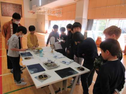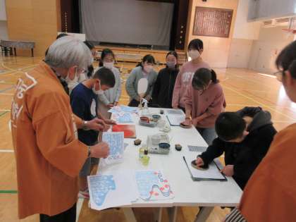 12月20日、経済産業省委託事業として5年生対象に「伝統工芸(木版画)を学ぼう」の特別授業を実施しました。子どもたちはグループごとに3種類の浮世絵版画の版を3〜4版摺り重ねて木版画(多版多色摺り)の伝統技法に触れました。摺り終わった後、型抜き、押印、張りの作業を経て木版画の団扇を仕上げることができました。