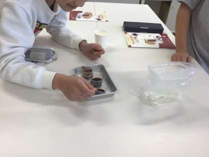 大豆、小麦、塩、を原料に、3種類の微生物による発酵を重ねてしょうゆが作られていることを、実物を見ながら学習しました。もろみ、もろみをしぼった生しょうゆ、売られているしょうゆの味を比べ、その違いに驚きました。