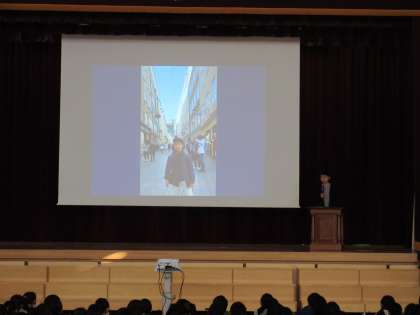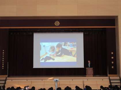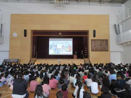 1月10日、朝の活動期間に海外派遣報告会を行いました。世田谷区立小中学生海外派遣とは、世田谷区立小中学校の小学校5年生と中学2年生が姉妹都市であるオーストリアのウイーン市、オーストラリアのバンバリー市で1週間ほど滞在して文化や風土に触れ、交流を深めることを目的としています。昨年の10月と11月に本校の5年生がオーストリアのウイーン市へ世田谷区の代表の一人として訪問し、引率のため本校の教員がオーストラリアのバンバリー市へ行きました。その時に体験したことや身に付けたことを全校児童に向けて報告する会をもちました。皆、しっかりと発表を聞いていました。