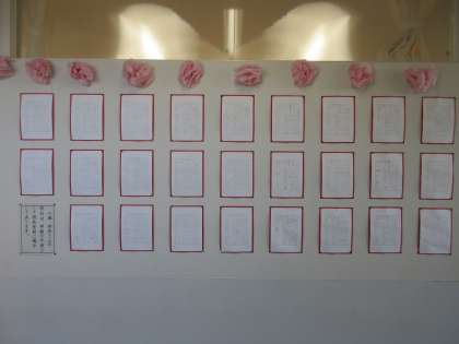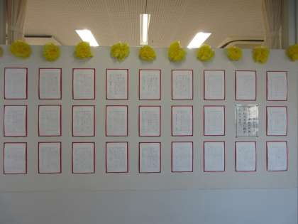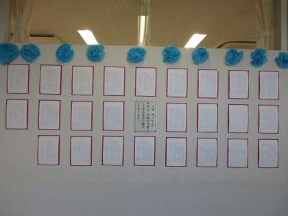 1/14〜1/20の期間、書き初め大会で書いた作品を各教室前、フリースペース等に展示して「書き初め展」を開催しています。1年生は鉛筆の持ち方に気を付けながら新年の思いを込めて書きました。保護者の皆様は期間中の1〜4校時の時間帯に鑑賞できますのでご都合のいい時間に来校し、子どもたちの力作をぜひご覧ください。