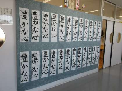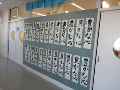 1/14〜1/20の期間、書き初め大会で書いた作品を各教室前、フリースペース等に展示して「書き初め展」を開催しています。5年生のお題は「豊かな心」子どもたちは丁寧に力強く毛筆で表しました。「保護者の皆様は期間中の1〜4校時の時間帯に鑑賞できますのでご都合のいい時間に来校し、子どもたちの力作をぜひご覧ください。