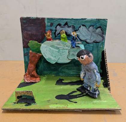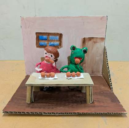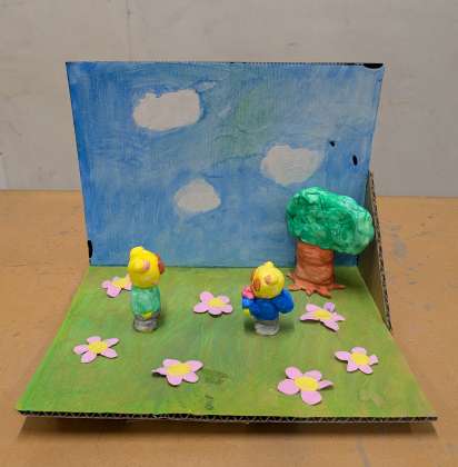 3年生が図工授業で制作した題材「本から飛び出した物語」を図工室前の廊下に展示しました。子どもたちは自分が読んだ物語からイメージを広げ、紙粘土で形をつくり、水彩絵の具で着色して立体作品をつくりました。保護者の皆様、ご来校の際にご覧ください。