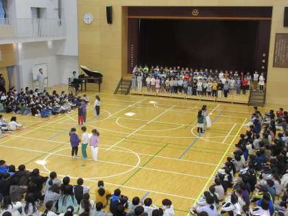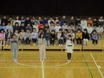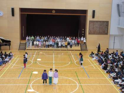 2月6日、朝の活動時間に音楽朝会を行いました。本日の学年発表では1年生が「ひらいた ひらいた」を代表児童が身振りを交えて元気よく歌いました。全校合唱では「冬の歌」皆で歌い、美しい歌声を体育館に響かせました。寒い中、お越しいただいた保護者の皆様、ありがとうございました。