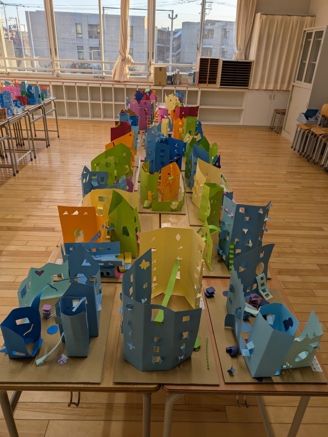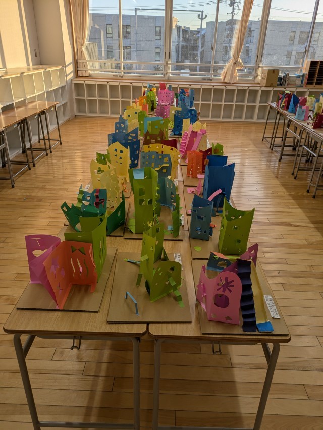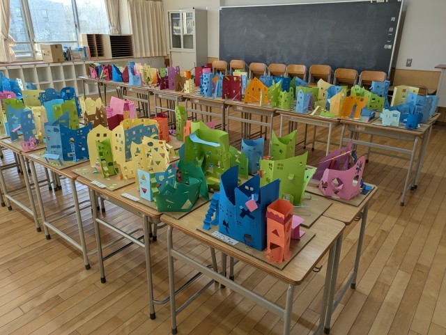 2年生が図工授業で題材「まどのあるたてもの」を制作しました。子どもたちはカッターを使う学習で切り方を練習しました。建物のイメージを広げて色画用紙を建物に見立て、窓やドアを切り抜きながら紙工作の作品をつくりました。保護者・地域の皆様、2階学習室に展示していますので学校公開で来校された際にはぜひご覧になってください。