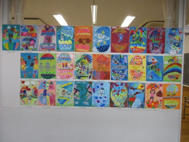 2年生が図工授業で題材「ふしぎなたまご」を制作しました。子どもたちはふしぎなたまごのイメージを広げ、模様や色を考え、たまごと生まれてくるものを絵の具やクレヨンで描きました。保護者・地域の皆様、2年生の廊下壁面に展示していますので学校公開の際にはぜひご覧になってください。